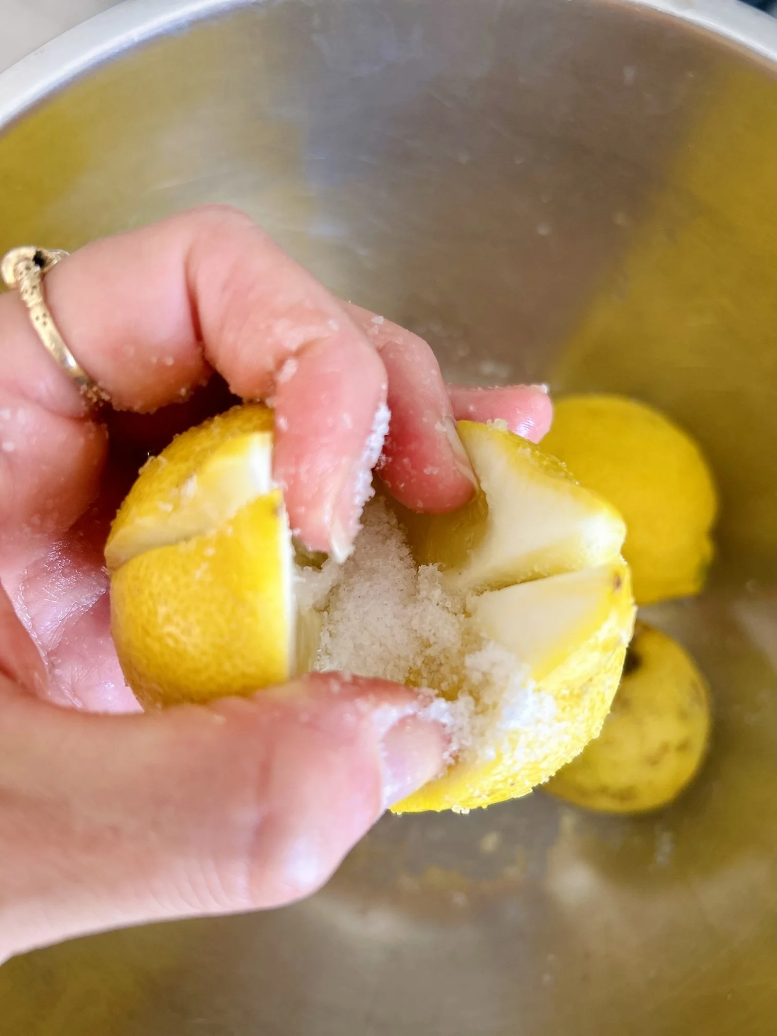 2. Open the lemons gently and pack 1 tablespoon of sea salt inside each lemon.